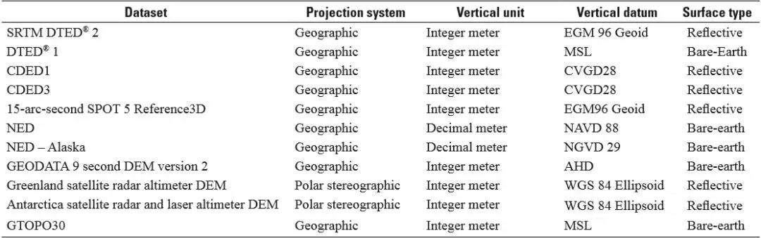GMTED2010的數據源具有多分辨率、多基準面、多坐標系的特征,NASA和NGA在制作GMTED2010產(chǎn)品時(shí),除了采用多分辨率外,還建立了包括最小高程、最大高程、平均高程、中間高程、高程標準偏差、系統統計采樣、增強特征曲線(xiàn)的七種高程產(chǎn)品。