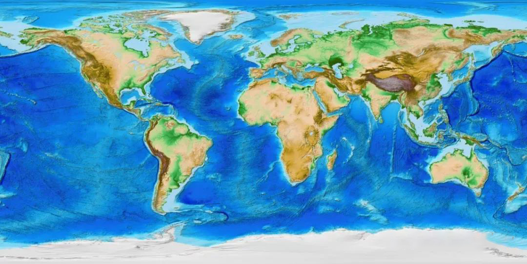 隨著(zhù)全球各領(lǐng)域研究對高分辨率DEM數據的需求不斷增強,同時(shí)新的高程數據獲取技術(shù)不斷涌現,USGS和NGA合作,十年磨一劍,于2010年共同推出了全球多分辨率地形高程數據(Global Multi-resolution Terrain Elevation Data,簡(jiǎn)稱(chēng)GMTED2010),在全球陸地區域提供30弧秒、15弧秒、7.5弧秒三種分辨率DEM數據。(在格陵蘭島和南極洲只提供30弧秒分辨率DEM數據,其他陸地區域均提供相當于1Km、500m、250m分辨率的DEM數據),下圖是GMTED2010全球30弧秒分辨率平均高程數據(-430/8625米)。