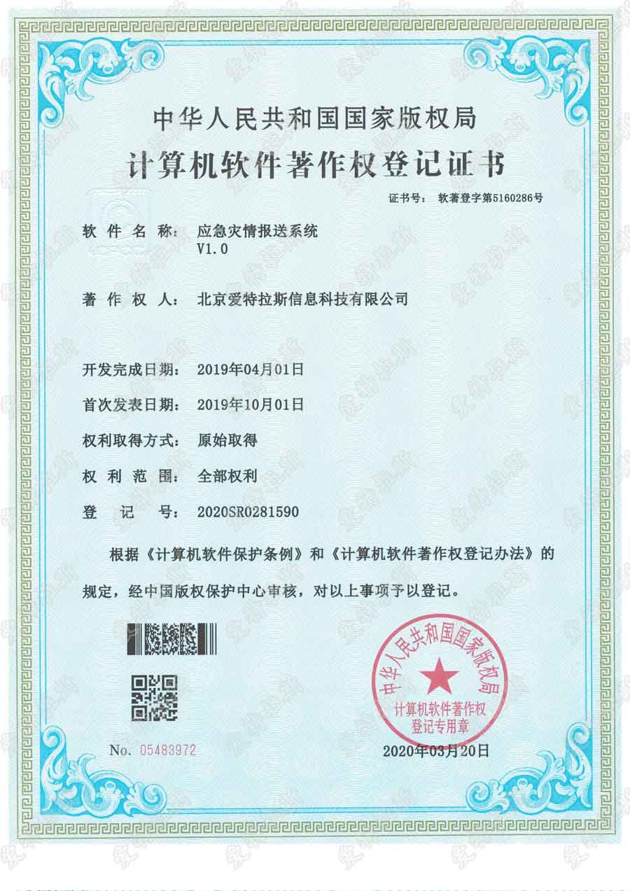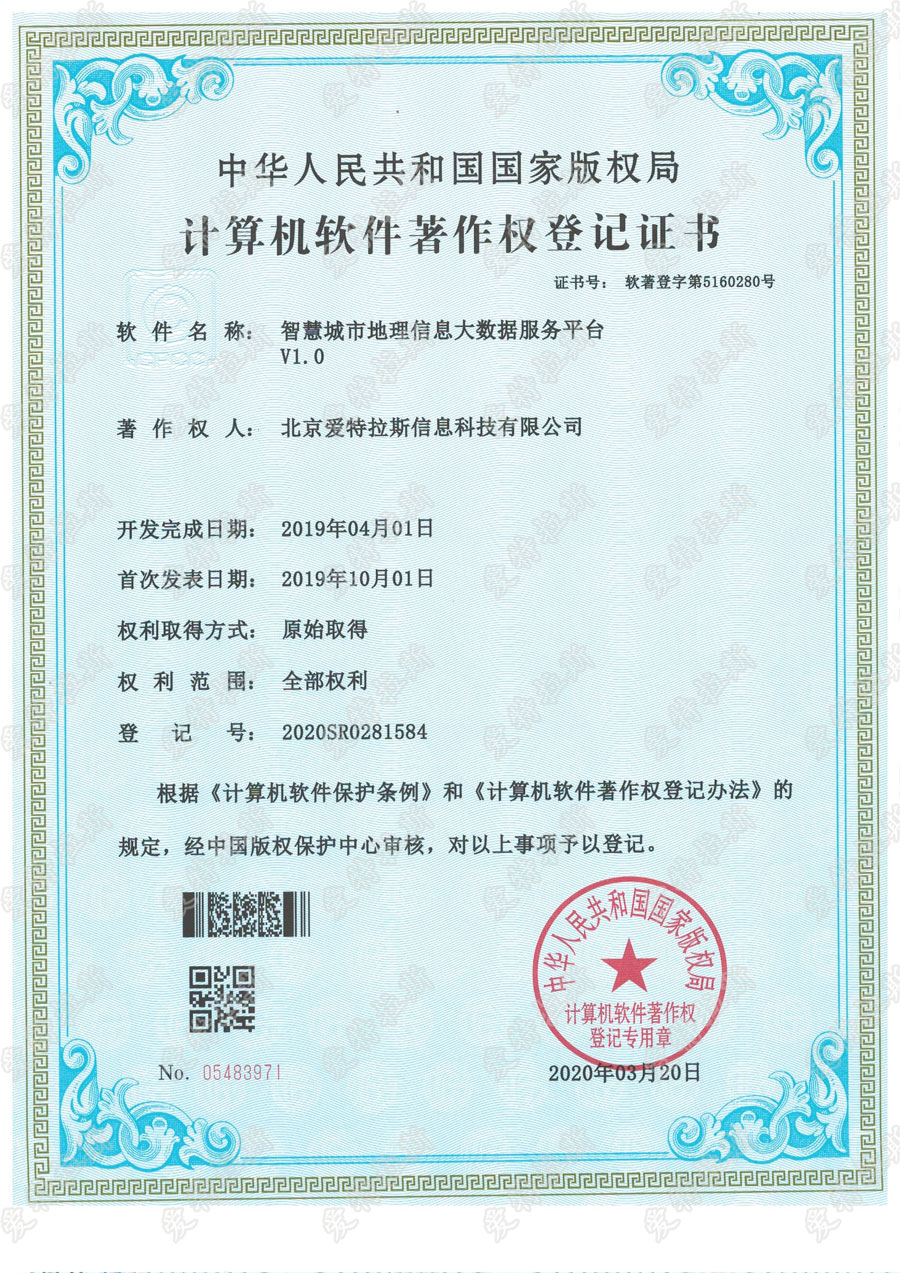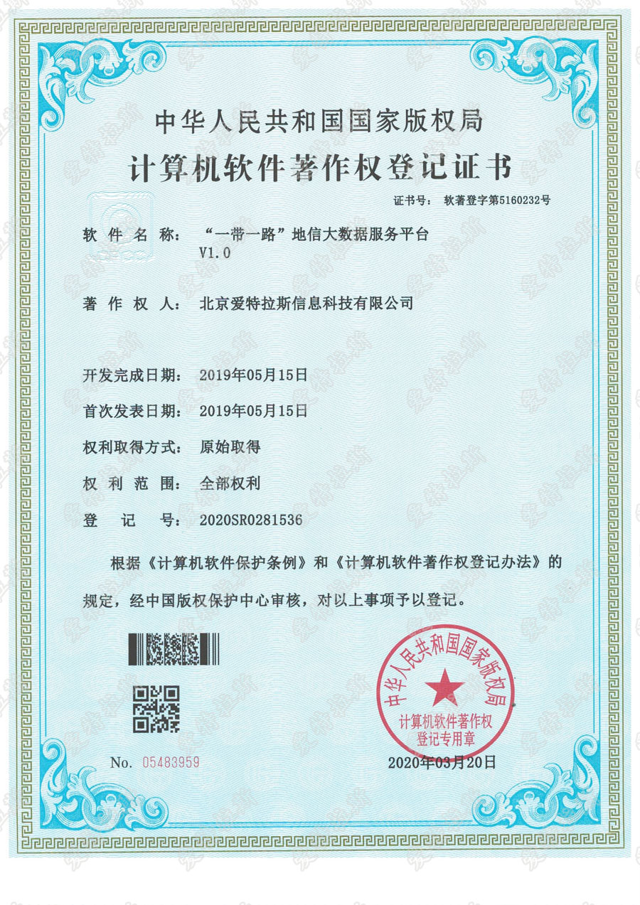 2020年3月我司又喜獲《ATLAS遙感AI平臺(V1.0)》、《輸電線(xiàn)路線(xiàn)樹(shù)距離衛星遙感服務(wù)平臺(V1.0)》、《ATLAS圖像AI平臺(V1.0)》、《“一帶一路”地信大數據服務(wù)平臺(V1.0)》、《智慧城市地理信息大數據服務(wù)平臺(V1.0)》、《應急災情報送系統(V1.0)》等六項軟件著(zhù)作權。截止目前,我司已取得包括時(shí)空數據產(chǎn)品、遙感AI產(chǎn)品、大數據共享服務(wù)平臺(WEB端、移動(dòng)端)在內的著(zhù)作權32項。