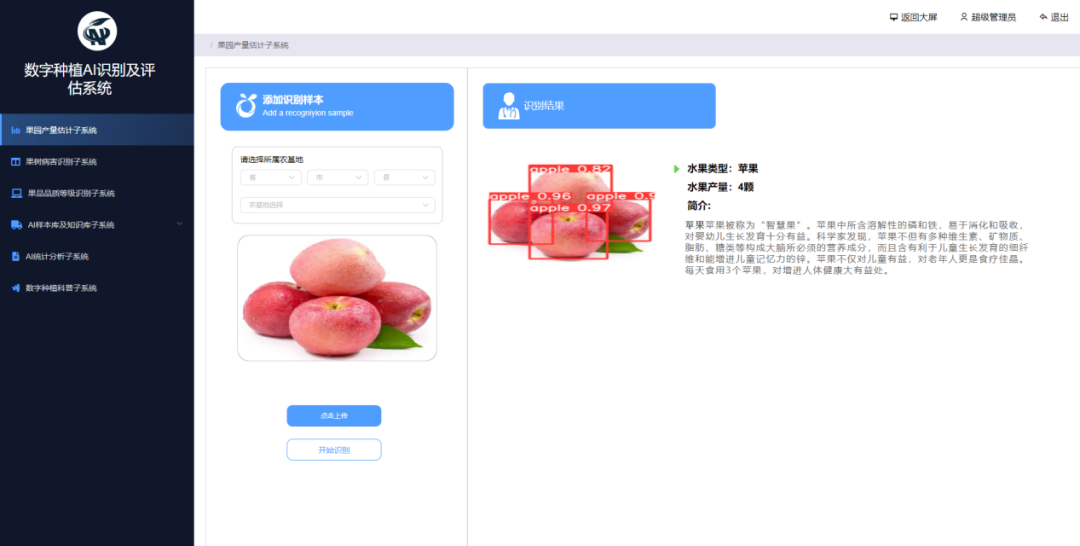 該項目是2022年開(kāi)發(fā)的數字種植業(yè)數據服務(wù)平臺?;趷?ài)特拉斯深度學(xué)習算法,系統建設了AI識別及評估子系統、果樹(shù)病害識別子系統、果品品質(zhì)等級識別子系統、AI樣本庫及知識庫子系統等多個(gè)果樹(shù)、果園AI識別識別系統,解決了果園產(chǎn)量預估困難、果樹(shù)病蟲(chóng)害監測識別難的問(wèn)題。