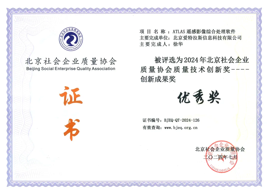 依據2024年北京社會(huì )企業(yè)質(zhì)量協(xié)會(huì )質(zhì)量技術(shù)創(chuàng )新獎評價(jià)體系和相關(guān)要求, 愛(ài)特拉斯自研產(chǎn)品-RSP遙感影像綜合處理軟件憑借在技術(shù)研發(fā)、產(chǎn)品創(chuàng )新等方面的突破性、創(chuàng )新性成果,經(jīng)過(guò)協(xié)會(huì )嚴格評審,公示公告。被評選為2024年北京社會(huì )企業(yè)質(zhì)量協(xié)會(huì )質(zhì)量技術(shù)創(chuàng )新獎--創(chuàng )新成果獎 優(yōu)秀獎。
